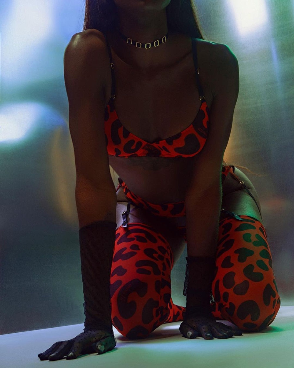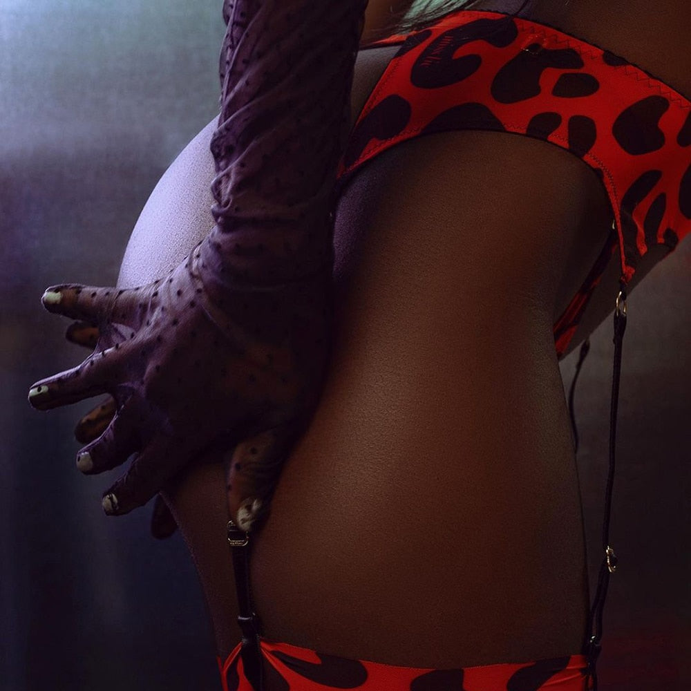 Ensemble de lingerie fine 5 pièces avec porte-jarretelles léopard sexy Leotina